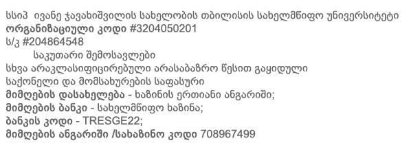 Beneficiary: TBILISI STATE UNIVERSITY (val.code 799780081 )(tsu identification 204864548)